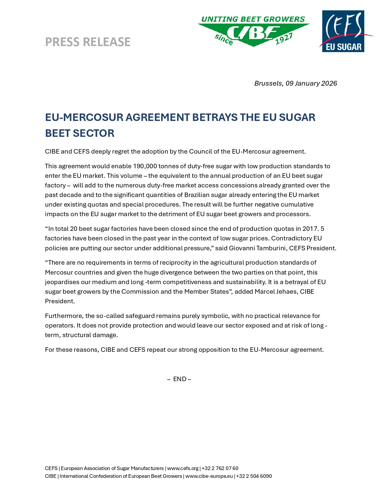 CIBE and CEFS deeply regret the adoption by the Council of the EU-Mercosur agreement.