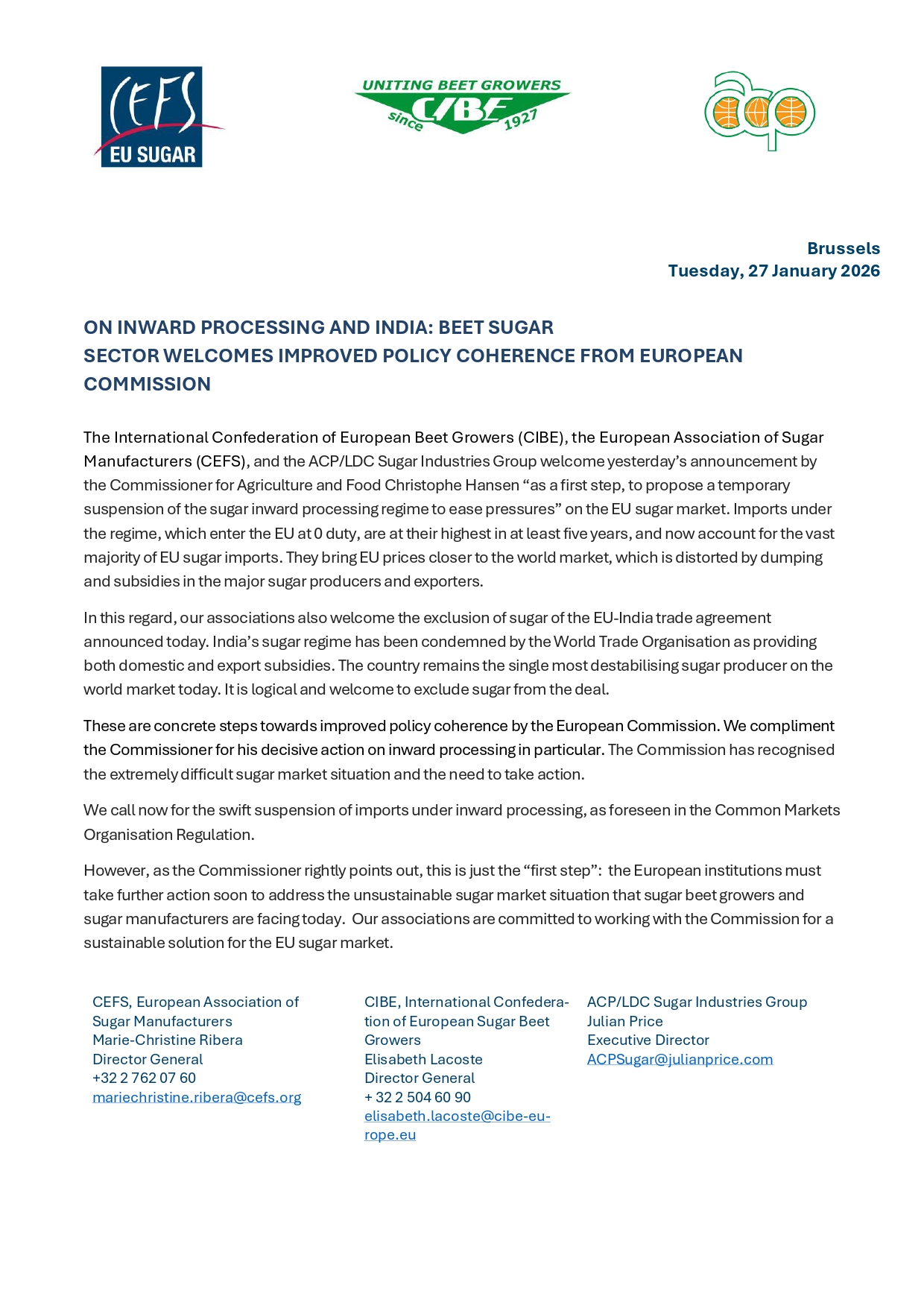ON INWARD PROCESSING AND INDIA: BEET SUGAR SECTOR WELCOMES IMPROVED POLICY COHERENCE FROM EUROPEAN COMMISSION